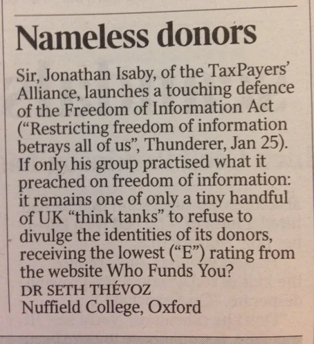 /In response to yesterday's piece in The Times by Jonathan Isaby of the TaxPayers' Alliance (an organisation known in media circles as "Three Men and a Blog" - though blessed with rather more money, from sources unknown), today's Times carries my own response in a letter: